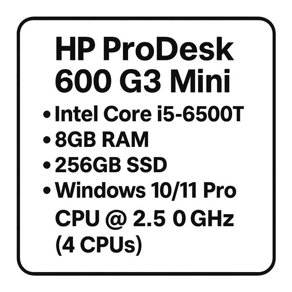 Processeur : Intel Core i5-6500T 2.50 GHz, turbo jusqu’à 3.10 GHz Mémoire vive : 8 Go DDR4 Stockage : SSD 256 Go pour une rapidité accrue Système d’exploitation : Windows 10/11 Pro Connectivité : Ports modernes, y compris USB 3.1 et DisplayPort Format : Design compact et moderne