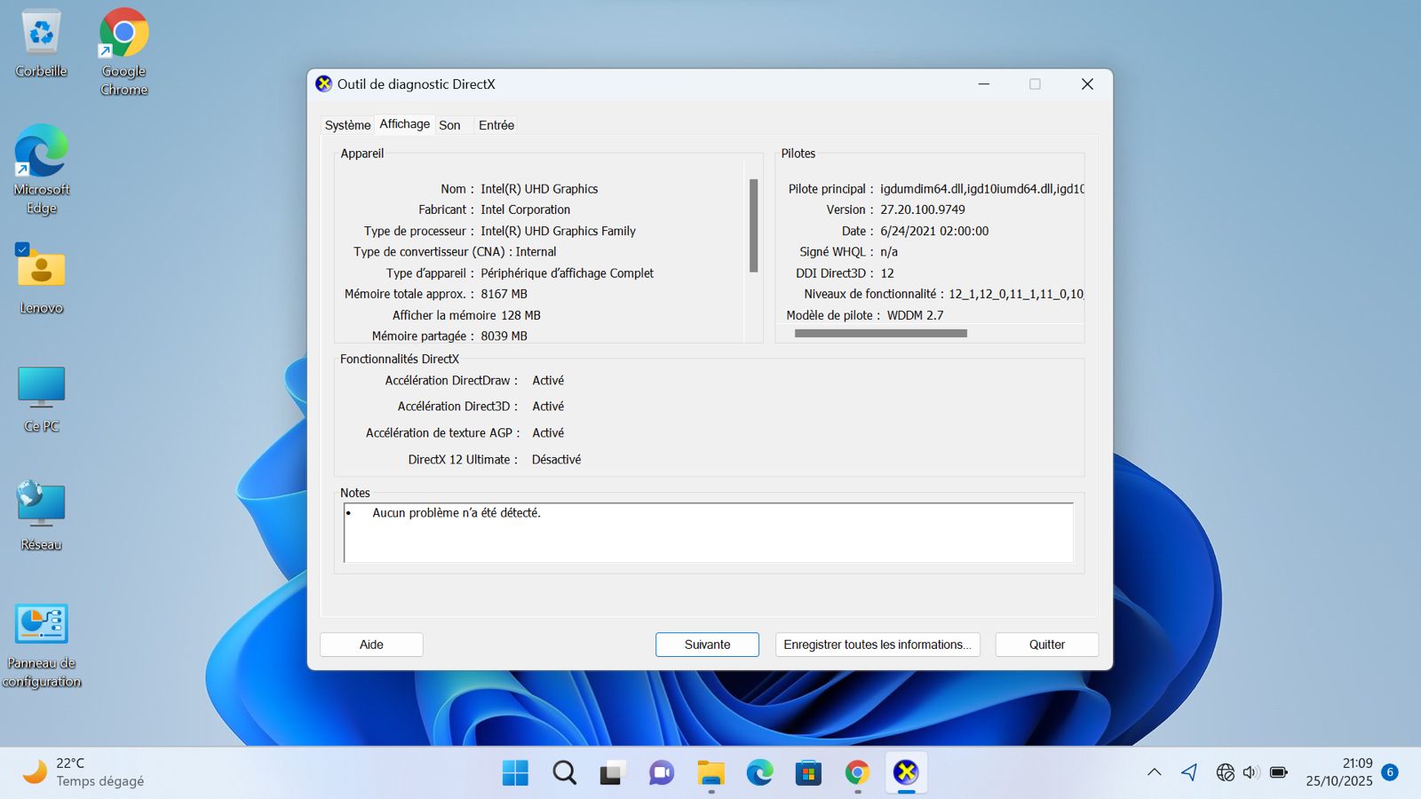 | Carte graphique | Intel UHD Graphics intégrée |